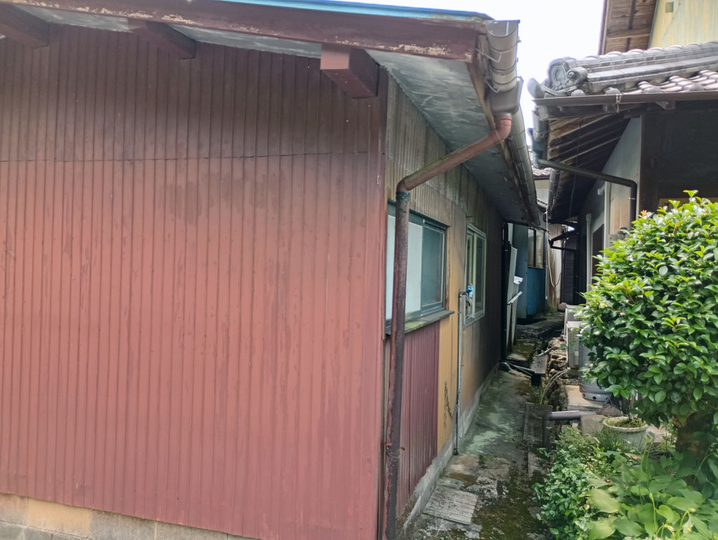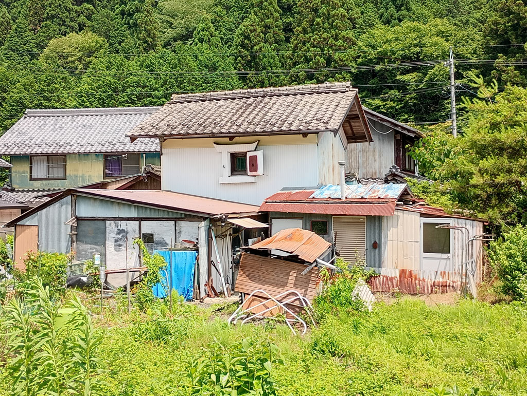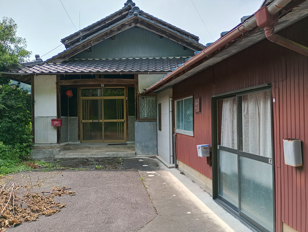 道路をはさんで川に面し、夏場にはホタルが飛びかう豊な自然環境の中にあります。道路から作業場と駐車スペース、その奥に玄関があります。下水道や水洗トイレも完備しているのでそのまま暮らすことも可能ですが、快適に過ごすにはリフォームが必要です。奥には蔵や手作りのガラスハウスが連なっていて、さまざまな用途に利用できそうです。
